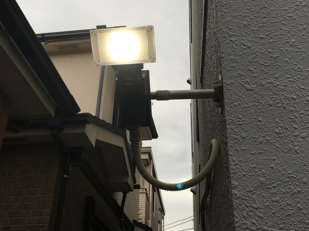 交換後の写真を見ていただければわかりやすいのですが、LED照明はとても明るいので威嚇効果は抜群です。また設定次第で人感センサーが反応したときのみ短時間点灯もしくは常夜灯としての使用が選択できます。