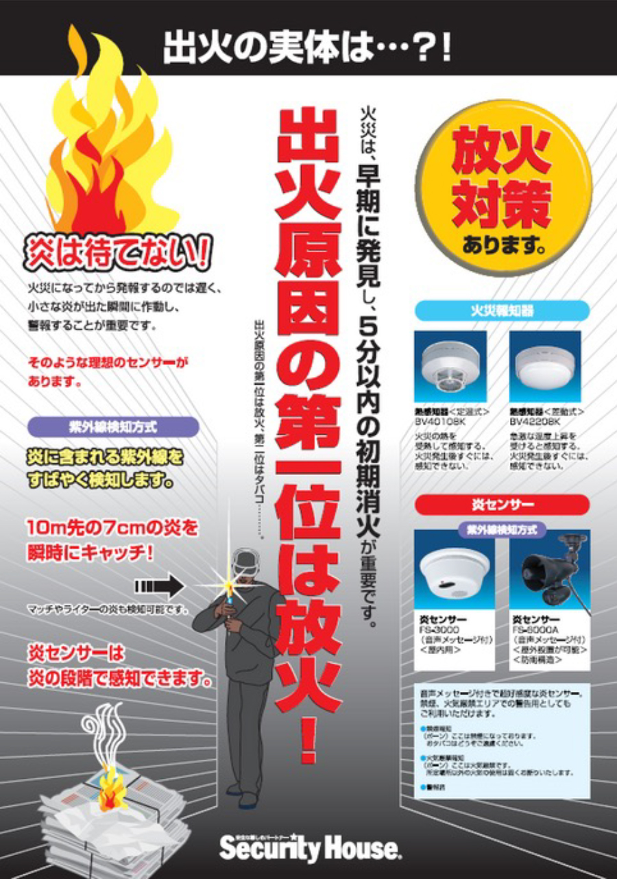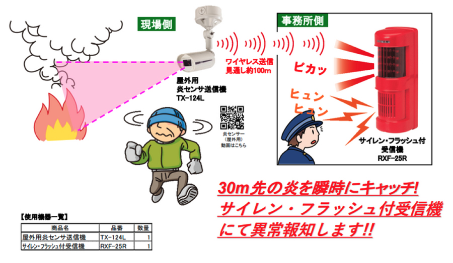 TOP ▸ 製品紹介 ▸ 炎センサー警戒システム 炎センサー警戒システム 自主機械警備システム 赤外線警戒システム 車両出庫報知システム 炎センサー警戒システム センサーライト警戒システム フォグガード警戒システム